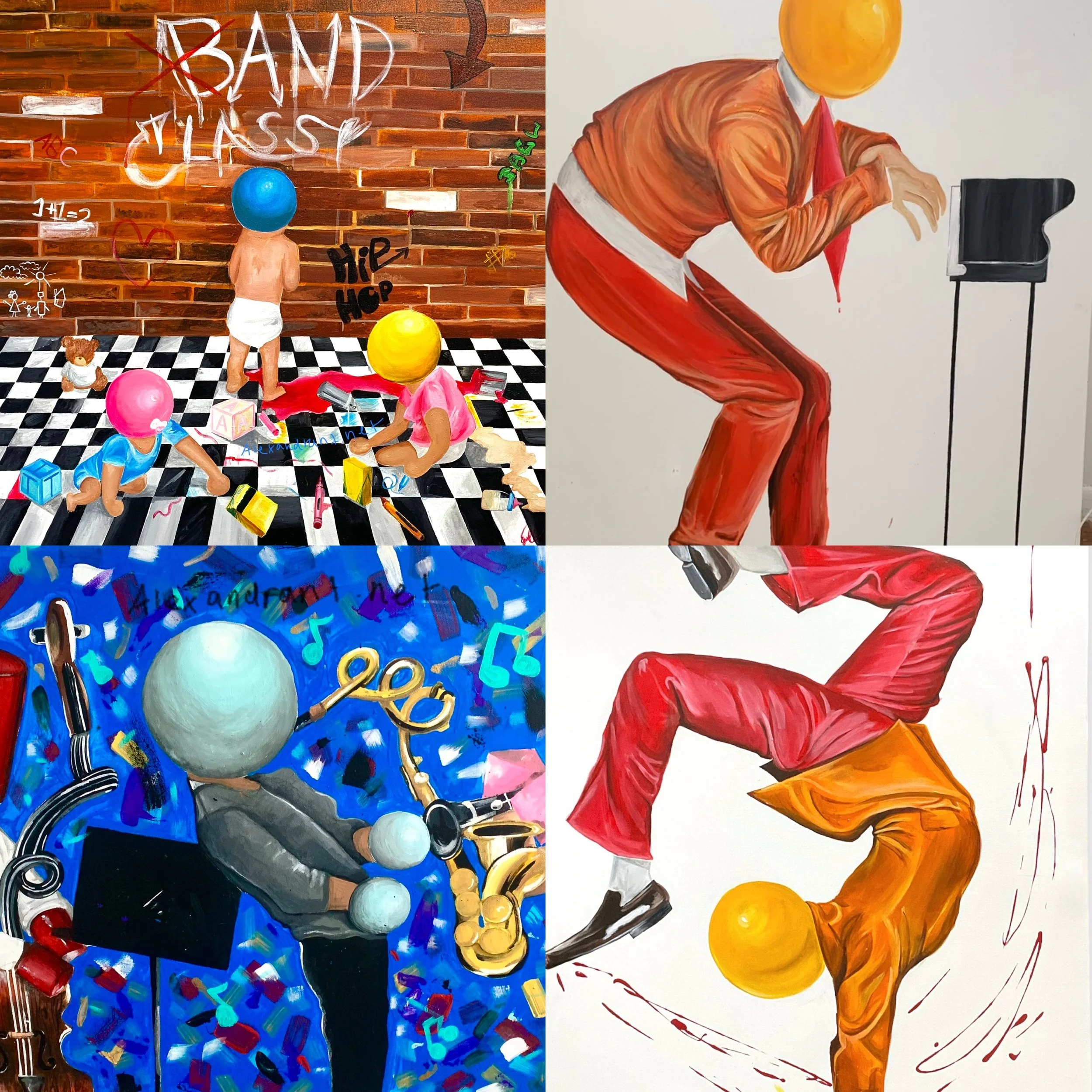 Band Class is my first art series, centered around musicians and expressive characters coming together in a shared space. The series captures moments of joy, connection, and creative energy less about performance and more about the feeling of being in a band: hanging out, experimenting, laughing, and existing in rhythm with one another. Each piece highlights personality and interaction, celebrating music as a social experience and a source of fun, freedom, and community